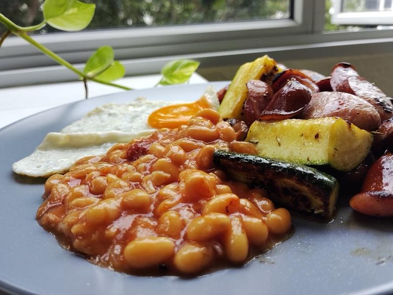 Bratwurst, zucchini, mushrooms, beans, egg