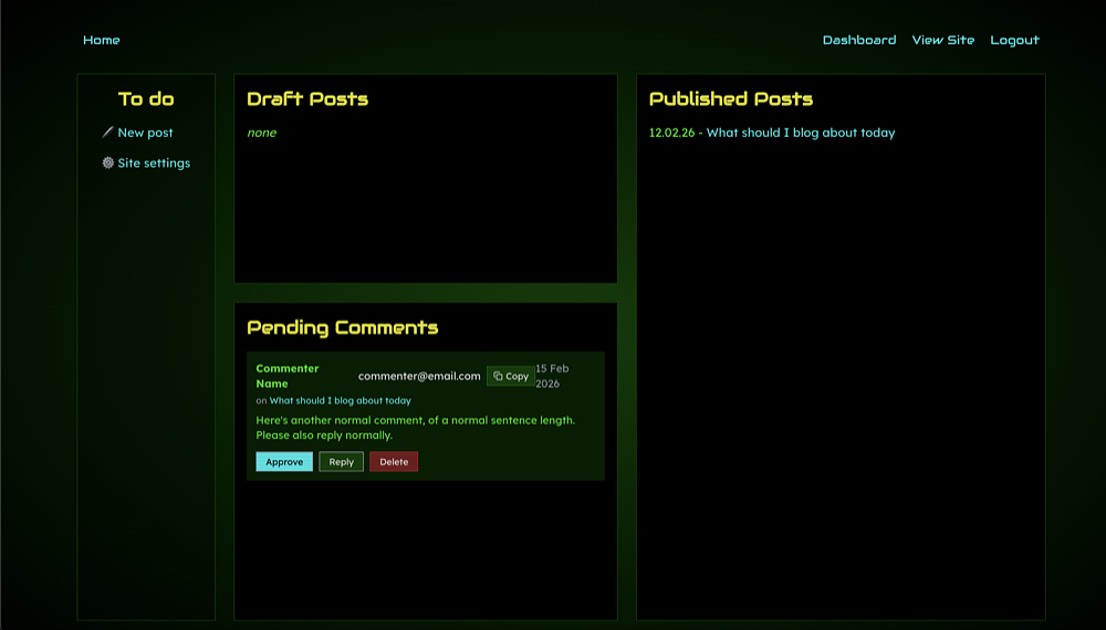 I also built out a whole dashboard for approving, replying to, and deleting comments. Damn, I am so satisfied with it hahaha!